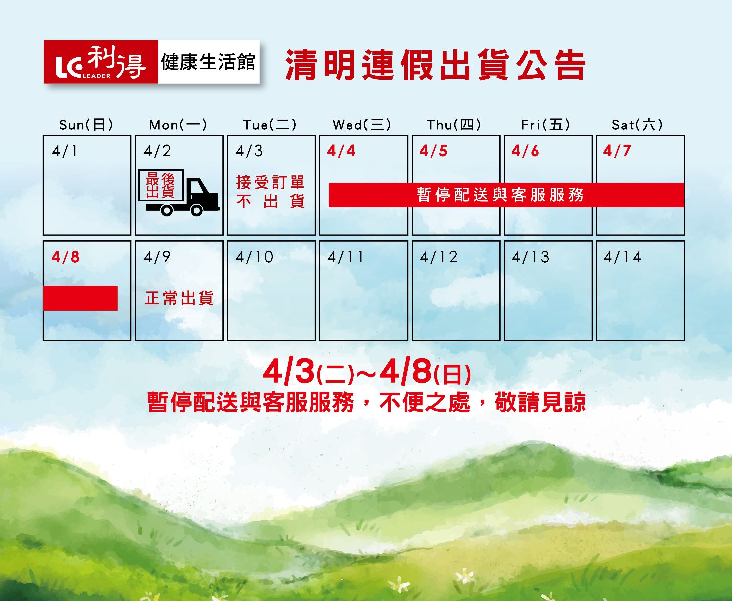 【利得公告】2018清明連假期間暫停出貨與客服,詳細內容