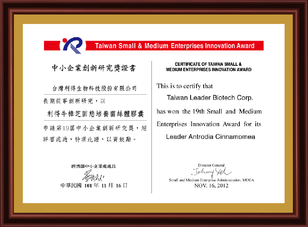 TAIWAN LEADER BIOTECH CORP.產品–「利得牛樟芝固態培養菌絲體膠囊」榮獲經濟部中小企業創新研究獎,並於2012年11月16日再台北世貿二館頒獎,由本公司董事長林進忠先生親自領獎,會後並接受媒體採訪闡述本公司得獎的原因與台灣利得對於牛樟芝研發與產品品質的堅持,同日並於台北世貿二館進行產品展出,並有優惠好康提供給現場購買的消費者,展出日期自11/16-11/17二日,機會難得要買要快喔~~