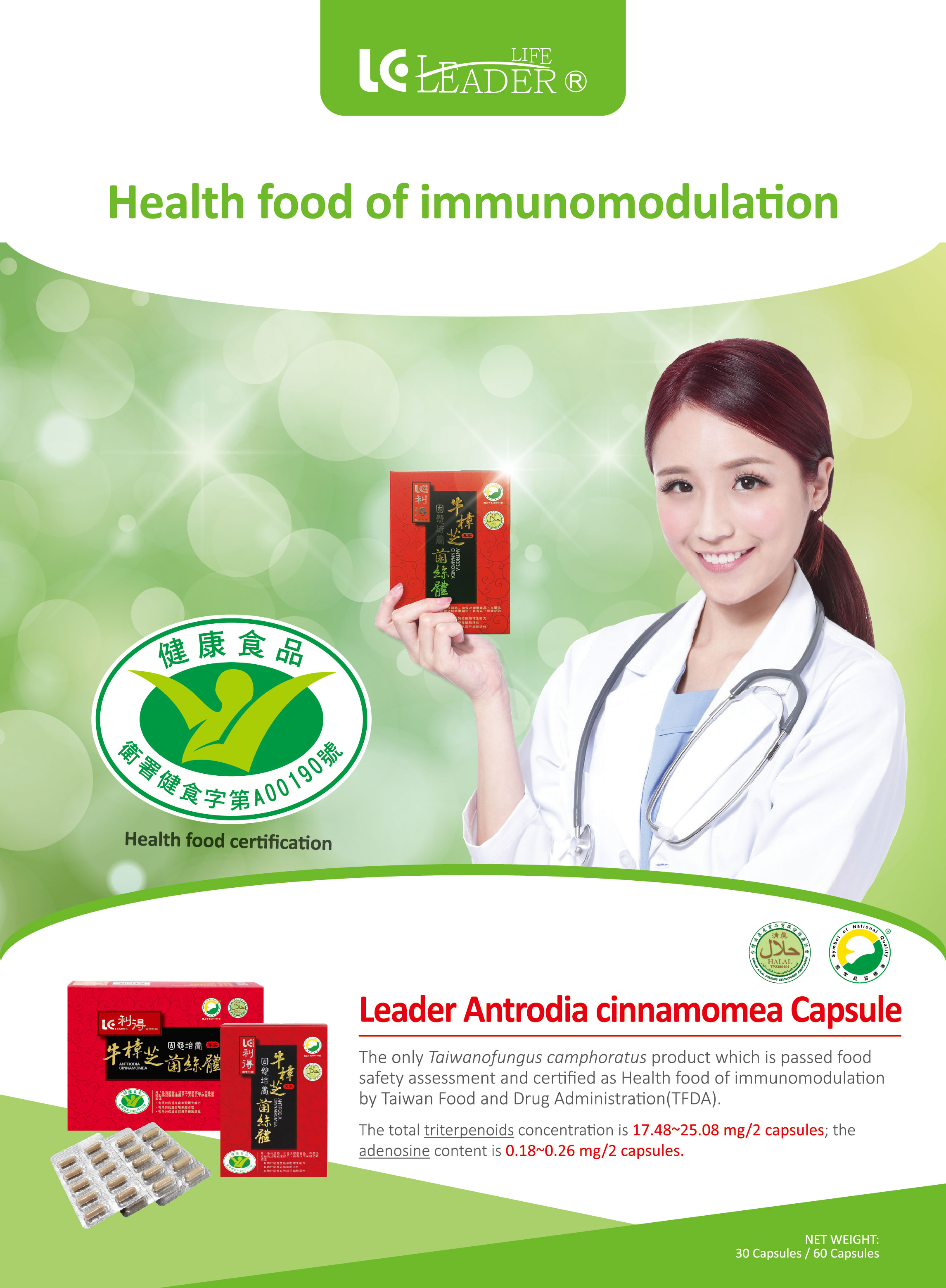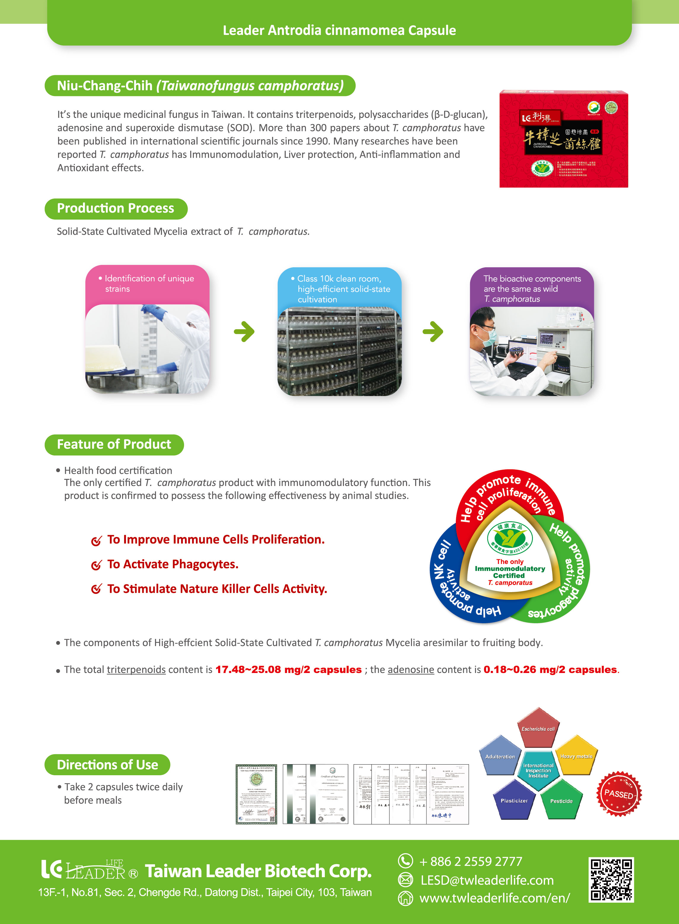 • Main ingredients:Extract of high-efficient solid-state cultivation of Taiwanofungus camphoratus (Antrodia Cinnamomea)