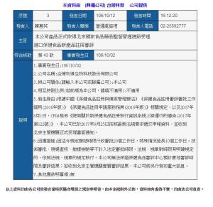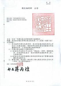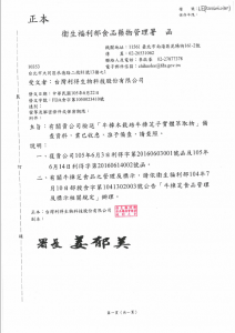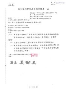 本公司「牛樟木栽培牛樟芝子實體萃取物」及「牛樟芝固態培養菌絲體萃取物」等牛樟芝原料,已於105年5月及6月經衛生福利部食品藥物管理署准予備查。