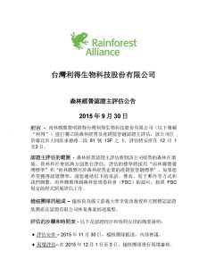 台灣利得生技『森林經營認證主評估公告』(Rainforest Alliance)