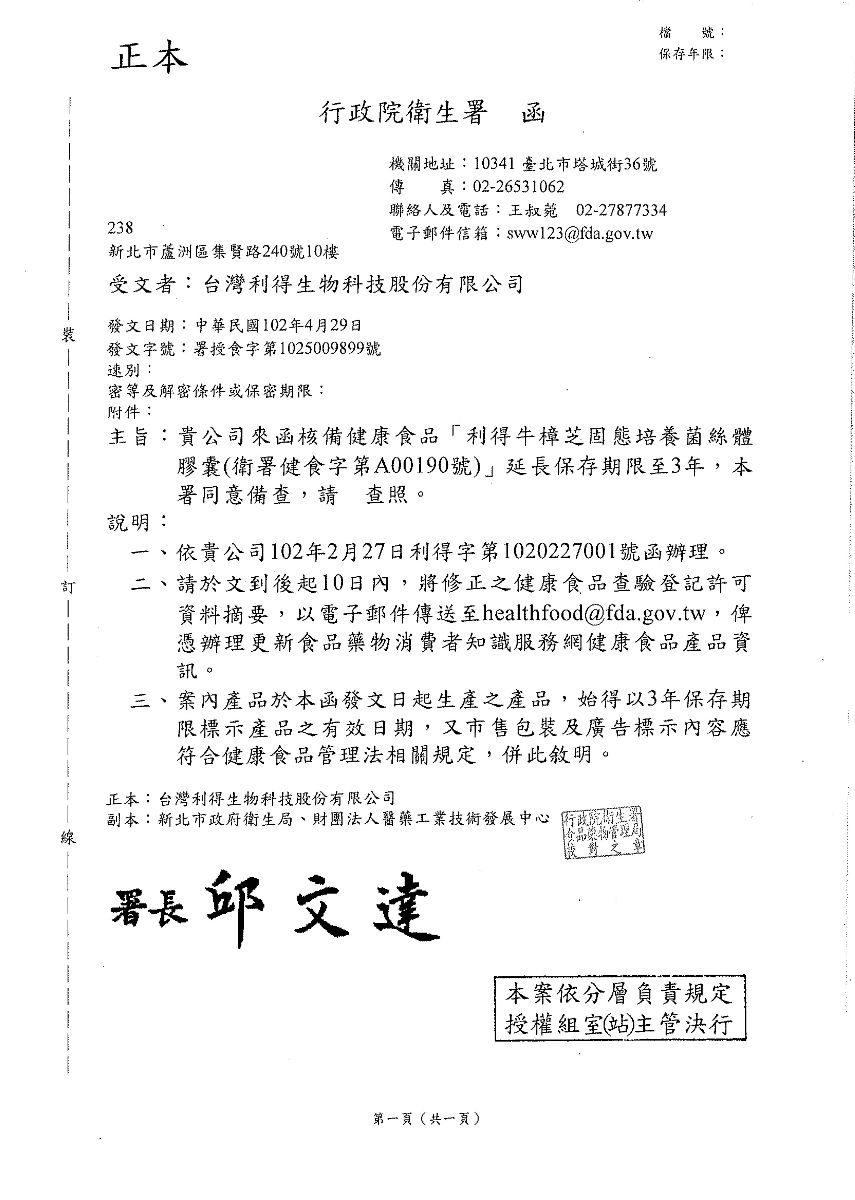 「利得牛樟芝固態培養菌絲體膠囊」延長保期限至三年