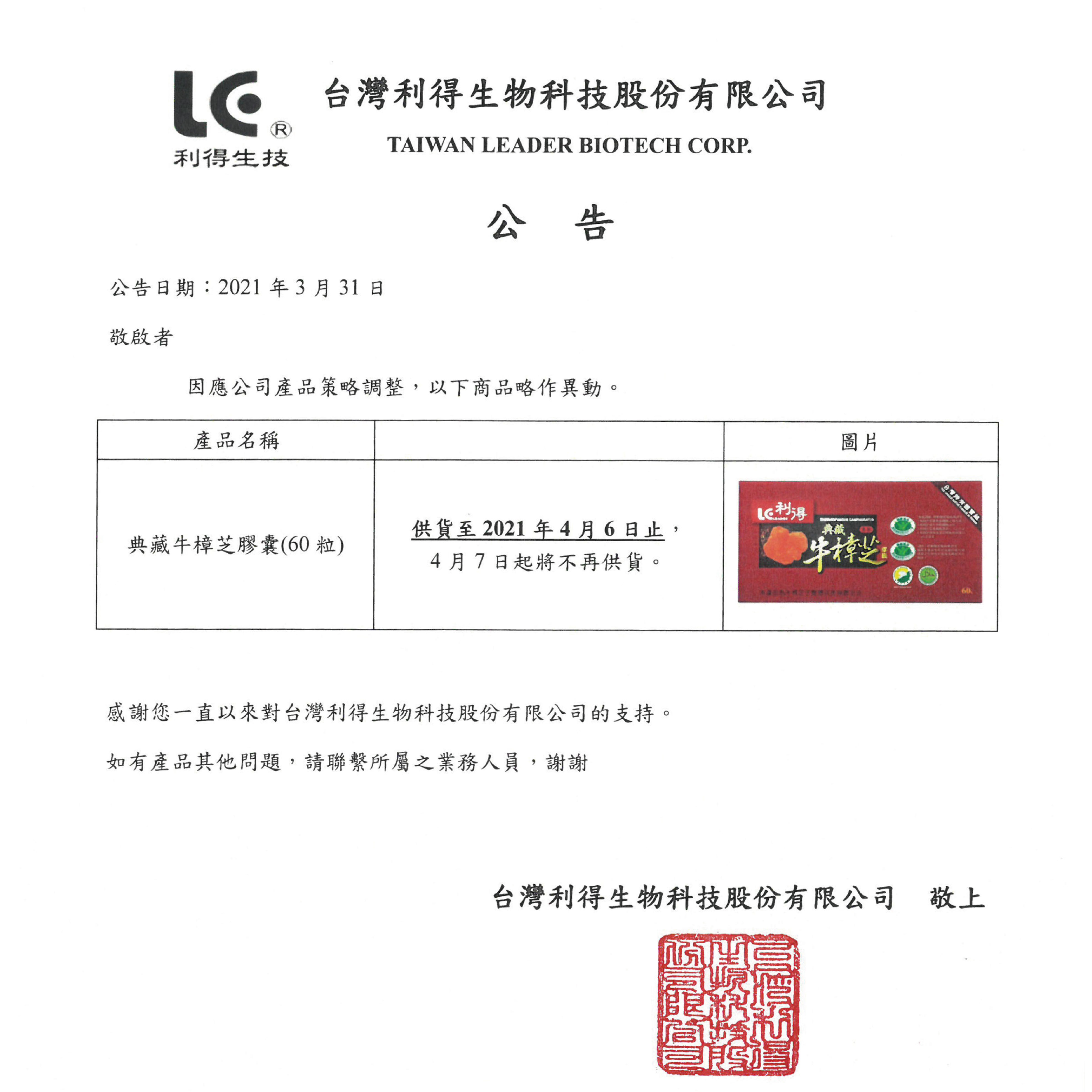 因應公司策略調整,典藏牛樟芝膠囊(60粒裝)於4/7起不再供貨